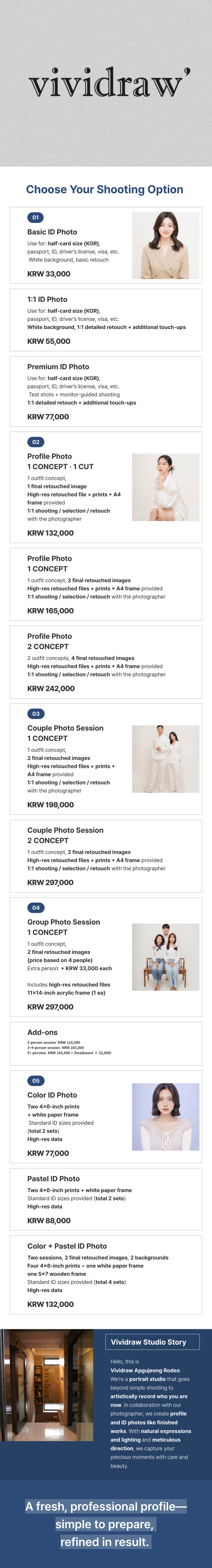 VIVIDRAW STUDIO5.0(10+)ID photo33,000 KRWVAT IncludedKey Points at a Glance 💖ID photoDetail pageReviewView detailReviewNewestLeave a review and share your experience with others.No reviews available.VIVIDRAW STUDIOCLOSEDApgujeong Rodeo Station, SeoulPublicGangnam-gu, Seoul, Republic of Korea 25, Eonju-ro 172-gil, 5 floorcopy서울 강남구 언주로172길 25 (신사동)copyRecommended ServicesPersonal profile photo132,000KRWVIVIDRAW STUDIO5.0(10+)Color ID photo77,000KRWVIVIDRAW STUDIO5.0(10+)