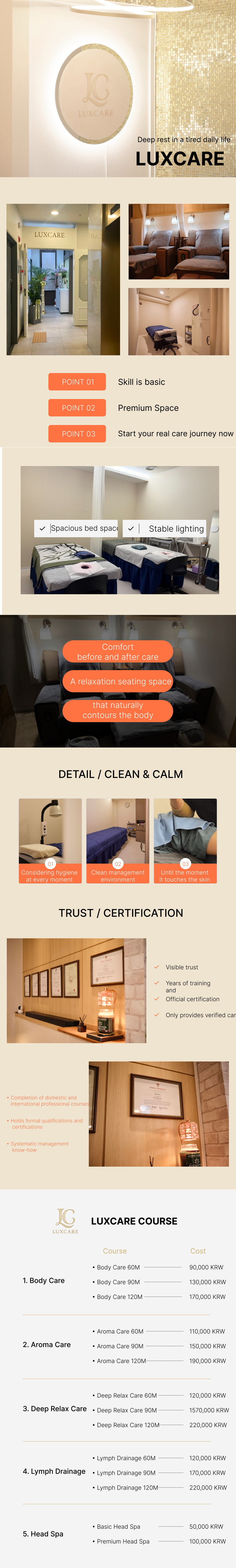LUX CARE5.0(10+)Body Care50,000 KRWKey Points at a Glance 💖Body Care,Aroma Care,Deep Relax Care, Lymph Drainage, Head SpaDetail pageReviewView detailReviewNewestLeave a review and share your experience with others.No reviews available.LUX CARE-B2, 107, Dosan-daero, Gangnam-gu, Seoulcopy서울 강남구 도산대로 107 (신사동, BIO)copy