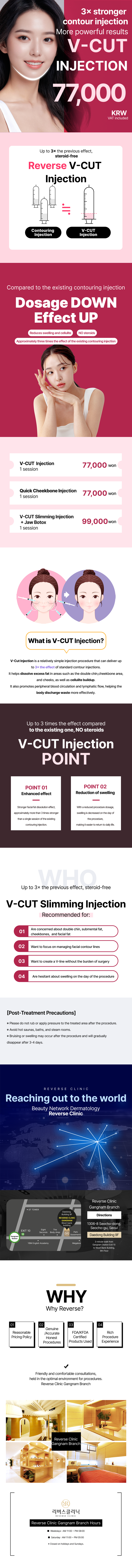 V-Cut Injection is a relatively simple injection procedure that can deliver up to 3Γ the effect of standard contour injections. It helps dissolve excess fat in areas such as the double chin,cheekbone area, and cheeks, as well as cellulite buildup. It also promotes peripheral blood circulation and lymphatic flow, helping the body discharge waste more effectively.