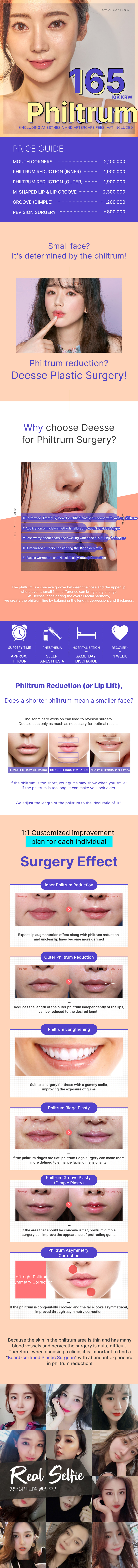 The philtrum is a concave groove between the nose and the upper lip, where even a small 1mm difference can bring a big change. At Deesse, considering the overall facial harmony, we create the philtrum line by balancing the length, depression, and thickness.