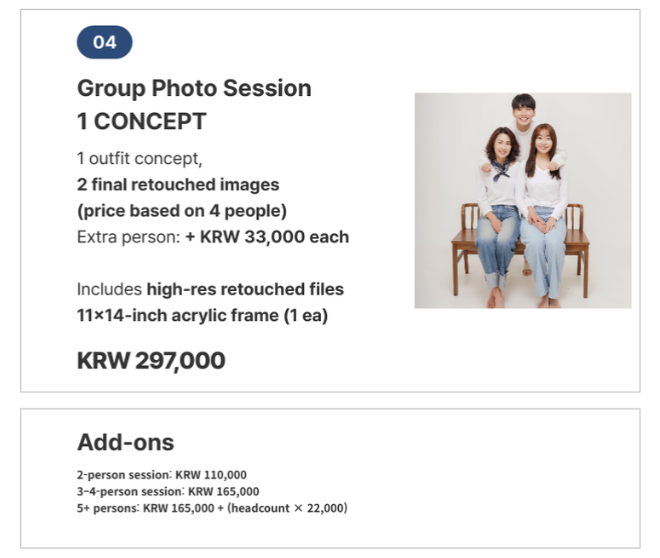 - 5 orang atau lebih: 165.000 KRW + (jumlah orang × 22.000)