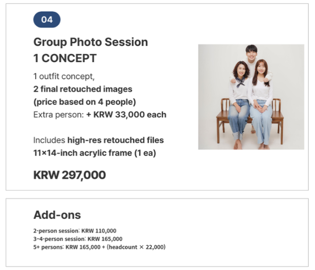 - Pemotretan 3–4 orang: 165.000 KRW