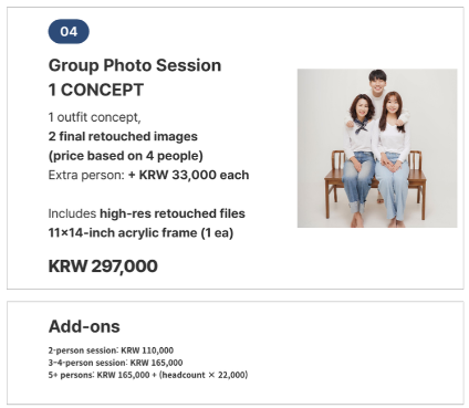 - 5 orang atau lebih: 165,000 KRW + (jumlah orang × 22,000)