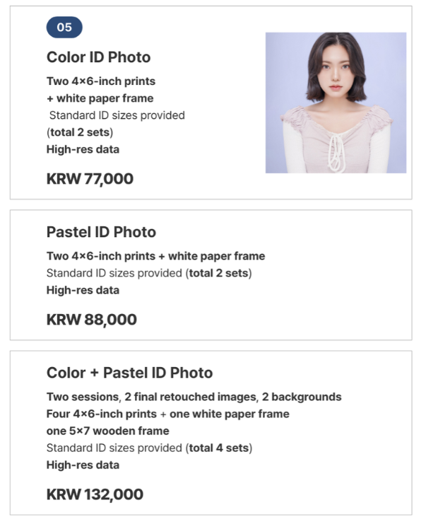 - Aplikasi: foto ID ukuran kecil (standar Korea), paspor, kartu identitas, SIM, visa, dan lainnya