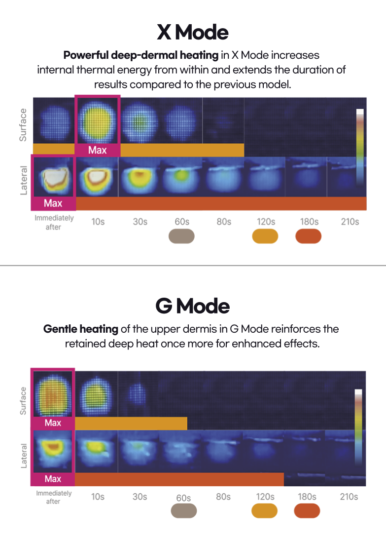 - G Mode:Pemanasan lembut pada lapisan atas dermis dengan durasi suhu permukaan hingga 30 detik dan suhu bagian dalam hingga 2 menit