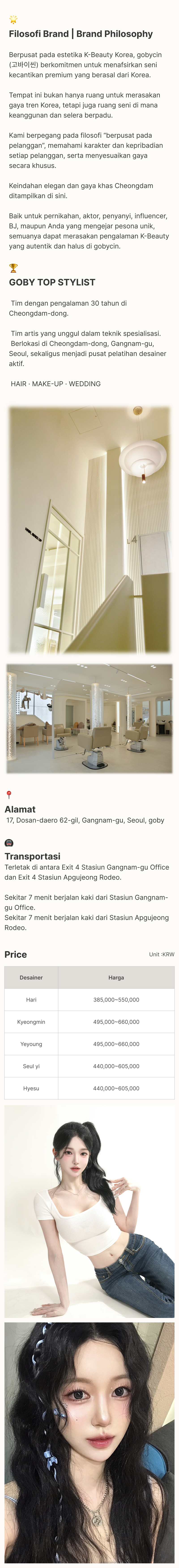 Perawatan & Perm ini dirancang dengan keunggulan khas gobycin—analisis personal dan teknik perm presisi ala Cheongdam. Tidak hanya membentuk tekstur, tetapi juga menjaga kondisi rambut agar tetap seimbang dan terawat.