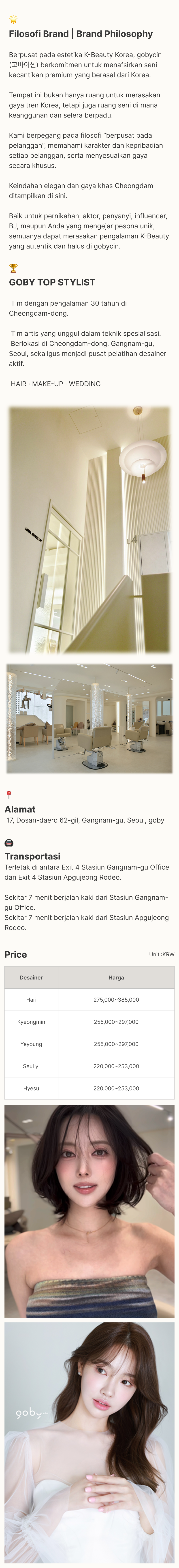 Potongan rambut dengan pendekatan khas Cheongdam. Gobycin menyesuaikan bentuk potongan dengan struktur wajah dan arah pertumbuhan rambut untuk hasil yang natural dan proporsional.