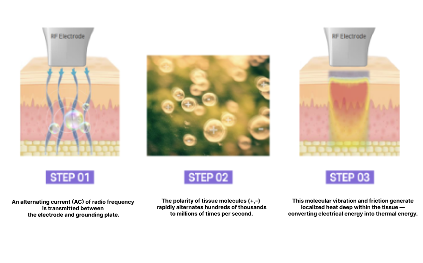 - Arus listrik frekuensi tinggi mengubah polaritas molekul jaringan puluhan hingga ratusan ribu kali per detik
