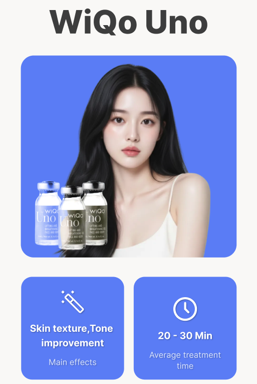 WiQo Uno adalah pilihan tepat bagi Anda yang menginginkan perawatan skin booster tanpa bekas jarum, memar, atau benjolan kecil, dengan hasil kulit yang lebih cerah dan sehat secara alami.