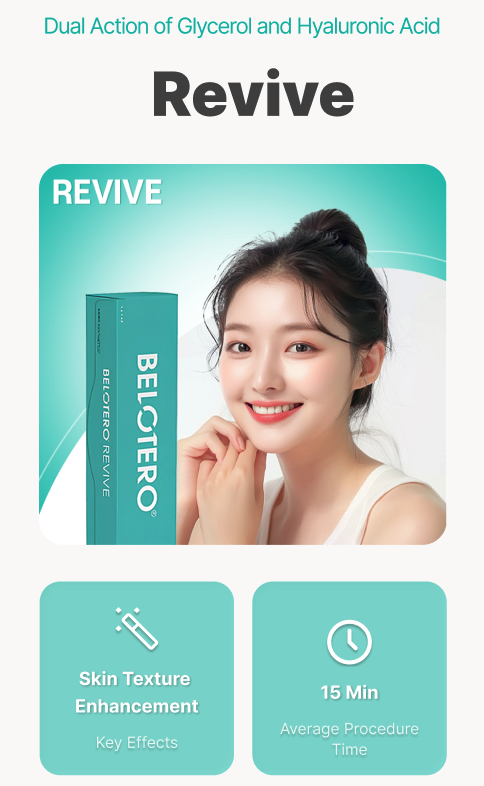 BELOTERO Revive adalah skin booster pertama di Korea yang mengandung gliserin dan menggunakan teknologi CPM yang telah disetujui FDA. Dengan kombinasi asam hialuronat dan gliserin, perawatan ini memberikan hidrasi unggul untuk menghasilkan kulit bercahaya dan sehat.