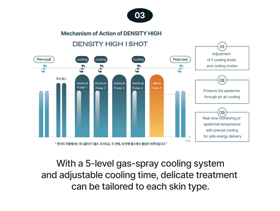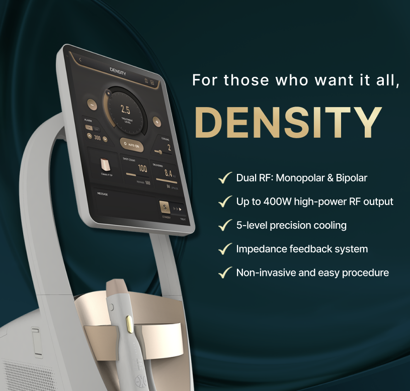 Dilengkapi dengan sistem pendinginan presisi 5 tingkat dan teknologi umpan balik impedansi, DENSITY HIGH melindungi kulit sambil menyalurkan energi radiofrekuensi berdaya tinggi hingga 400W tanpa area yang terlewat.