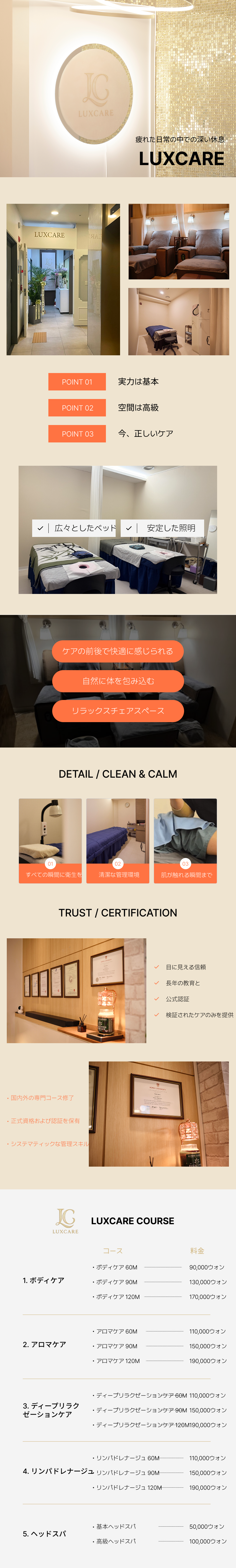 LUX CARE5.0(10+)Body Care50,000 KRWポイントをひと目でチェック 💖ボディケア,アロマケア,ディープリラクゼーションケア,リンパドレナージュ,ヘッドスパDetail pageReviewView detail口コミ新着順口コミを投稿して、体験をシェアしましょう!レビューがありません。LUX CARE-ソウル特別市 江南区 トサンデロ 107 地下2階住所コピー서울 강남구 도산대로 107 (신사동, BIO)住所コピー