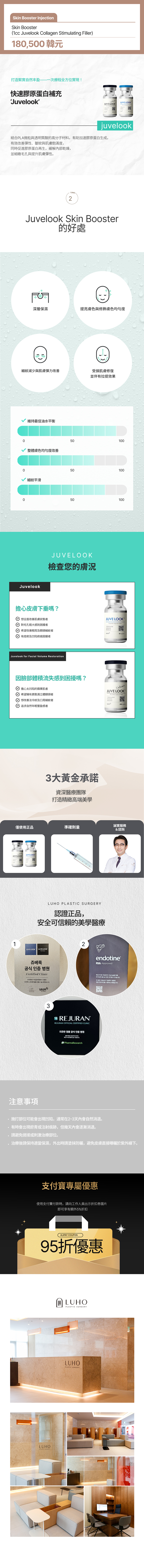 JUVELOOK是結合PLA微粒與透明質酸的高分子材料,有助加速膠原蛋白生成, 有效改善彈性、皺紋與肌膚飽滿度, 同時促進膠原蛋白再生,緩解內部乾燥, 並細緻毛孔與提升肌膚彈性。