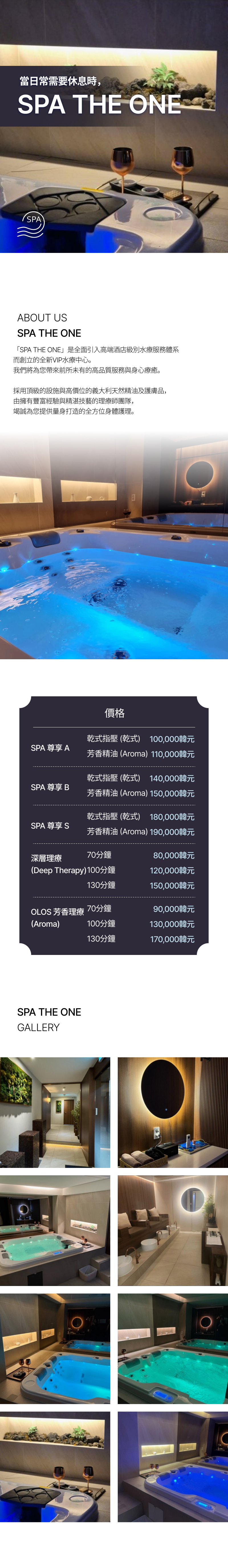 「SPA THE ONE」是全面引入高端酒店級別水療服務體系 而創立的全新VIP水療中心。 我們將為您帶來前所未有的高品質服務與身心療癒。 採用頂級的設施與高價位的義大利天然精油及護膚品, 由擁有豐富經驗與精湛技藝的理療師團隊, 竭誠為您提供量身打造的全方位身體護理。