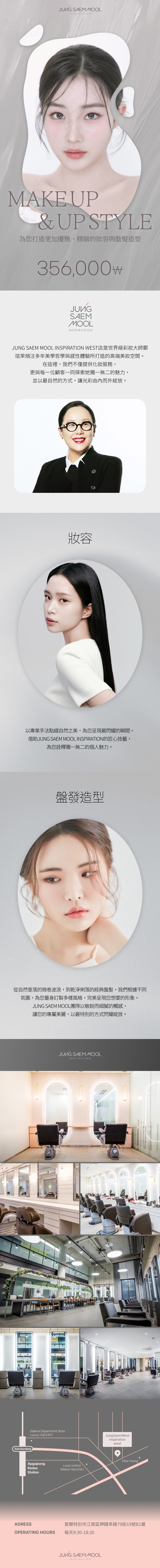JUNG SAEM MOOL INSPIRATION West4.5(100+)Make up & & up style356,000 KRW重點速覽 💖為您打造更加優雅、精緻的妝容與盤髮造型Detail pageReviewView detail評價最新發布歡迎留下你的使用體驗,與更多用戶一起分享暫無評價JUNG SAEM MOOL INSPIRATION WestCLOSED首爾市 新沙站私密性韓國 首爾 江南區 狎鷗亭路79街 19號 B1層複製地址서울 강남구 압구정로79길 19 (청담동, 레인 에비뉴)複製地址