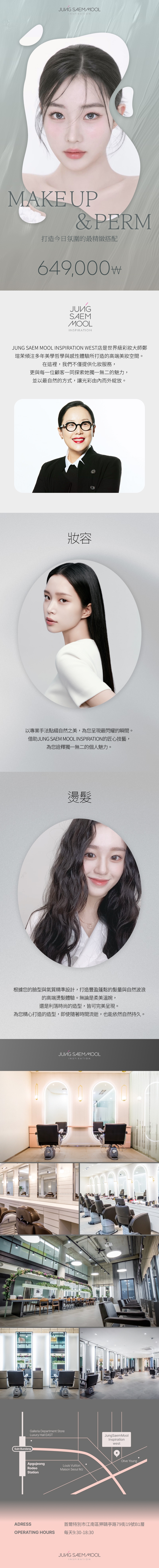 JUNG SAEM MOOL INSPIRATION West4.5(100+)Make up & & perm649,000 KRW重點速覽 💖打造今日氛圍的最精緻搭配 Detail pageReviewView detail評價最新發布歡迎留下你的使用體驗,與更多用戶一起分享暫無評價JUNG SAEM MOOL INSPIRATION WestCLOSED首爾市 新沙站私密性韓國 首爾 江南區 狎鷗亭路79街 19號 B1層複製地址서울 강남구 압구정로79길 19 (청담동, 레인 에비뉴)複製地址