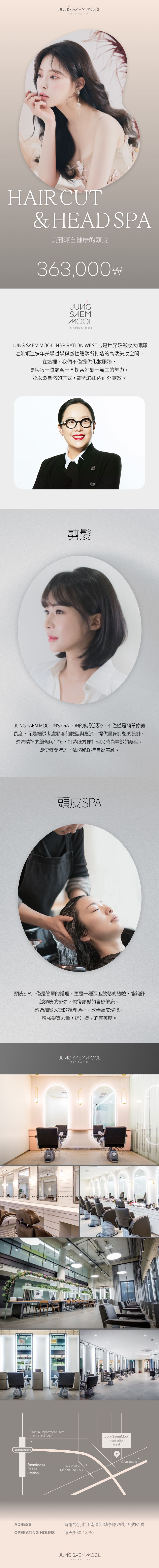 JUNG SAEM MOOL INSPIRATION West4.5(100+)hair cut & & head spa363,000 KRW重點速覽 💖美麗源自健康的頭皮Detail pageReviewView detail評價最新發布歡迎留下你的使用體驗,與更多用戶一起分享暫無評價JUNG SAEM MOOL INSPIRATION WestCLOSED首爾市 新沙站私密性韓國 首爾 江南區 狎鷗亭路79街 19號 B1層複製地址서울 강남구 압구정로79길 19 (청담동, 레인 에비뉴)複製地址推薦服務Hair Cut88,000KRWJUNG SAEM MOOL INSPIRATION West4.5(100+)