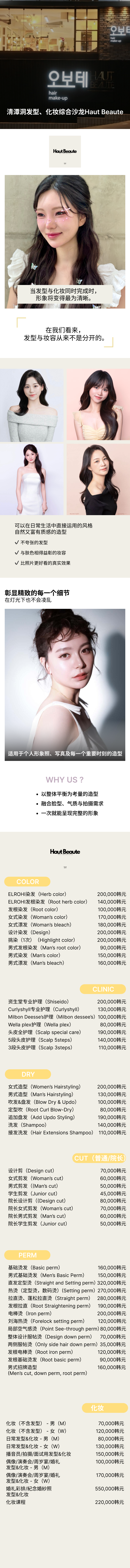 Haut beaute4.8(50+)Hair&Make-up35,000 KRW重点速览 💖以整体平衡为考量的造型 融合脸型、气质与拍摄需求 一次就能呈现完整的形象#定制发型#擅长剪男性发型的地方#女性装造发型#擅长染发的美发店#定制妆容Detail pageReviewView detail评价按最新发布欢迎留下你的使用体验,与更多用户一起分享暂无评价。Haut beauteCLOSED首尔市 江南区厅站首尔市 江南区 三成路133街 4号 2层(Haut beaute)复制地址서울 강남구 삼성로133길 4 (청담동)复制地址