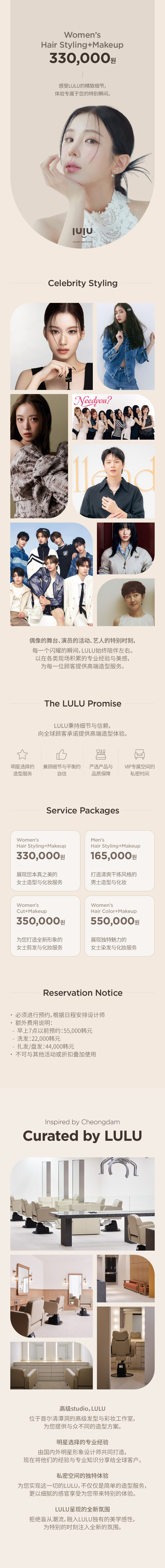 LULUWomen's Hair Styling+Makeup330,000 KRWVAT Included重点速览 💖展现您本真之美的 女士造型与化妆服务Detail pageReviewView detail评价按最新发布欢迎留下你的使用体验,与更多用户一起分享暂无评价。LULUCLOSED首尔市 狎鸥亭罗德奥站公开美妆/化妆品首尔特别市江南区宣陵路152街33(清潭洞)复制地址서울 강남구 선릉로152길 33 (청담동)复制地址